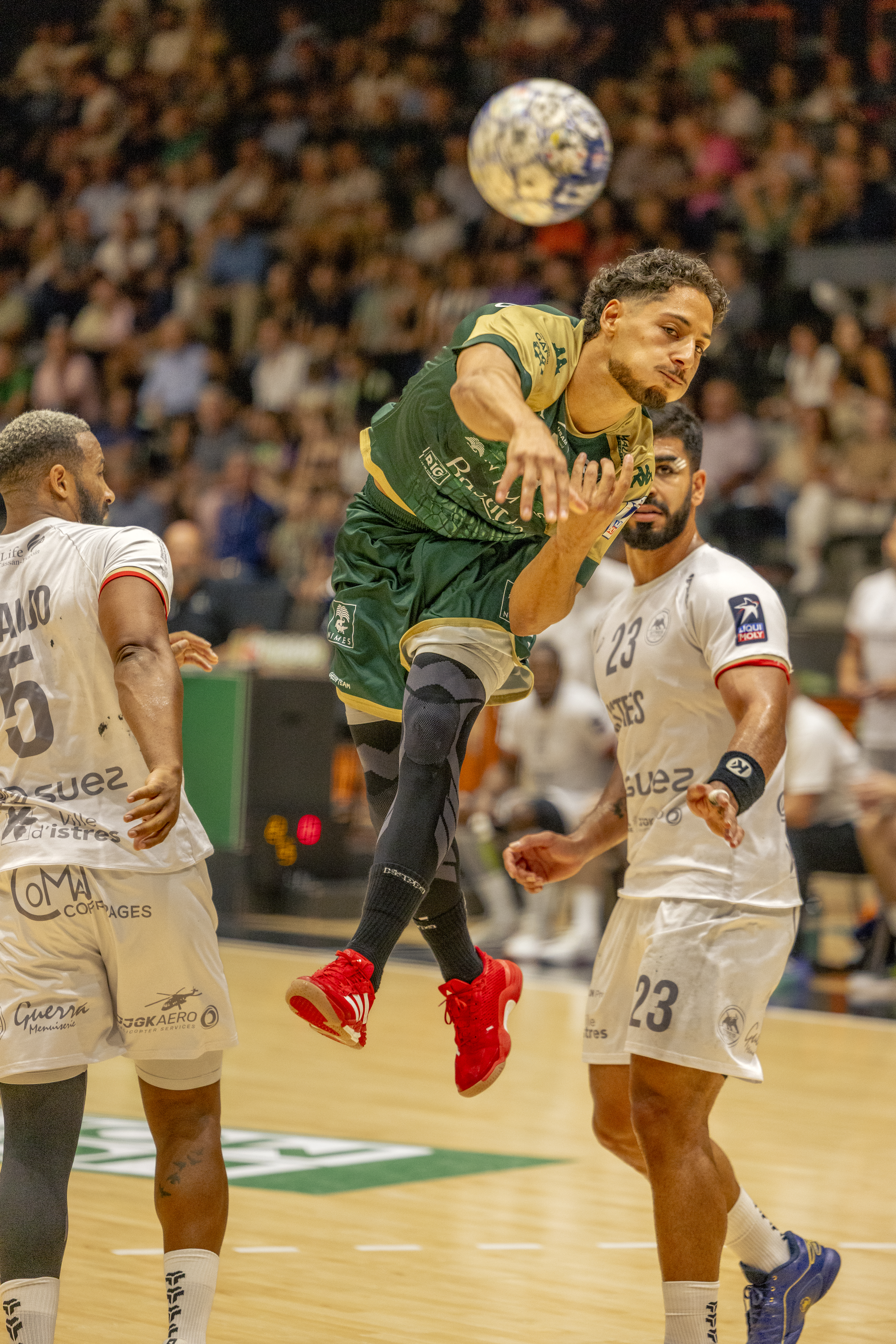 Cette saison, j’ai le plaisir de suivre le club de handball nîmois, l’USAM, qui évolue en Liqui Moly Starligue. Les photos que je réalise au plus près du terrain sont très souvent partagées par les joueurs de l’équipe professionnelle sur leurs réseaux sociaux, ce qui permet de donner vie à l’action et à l’émotion du match auprès des fans.